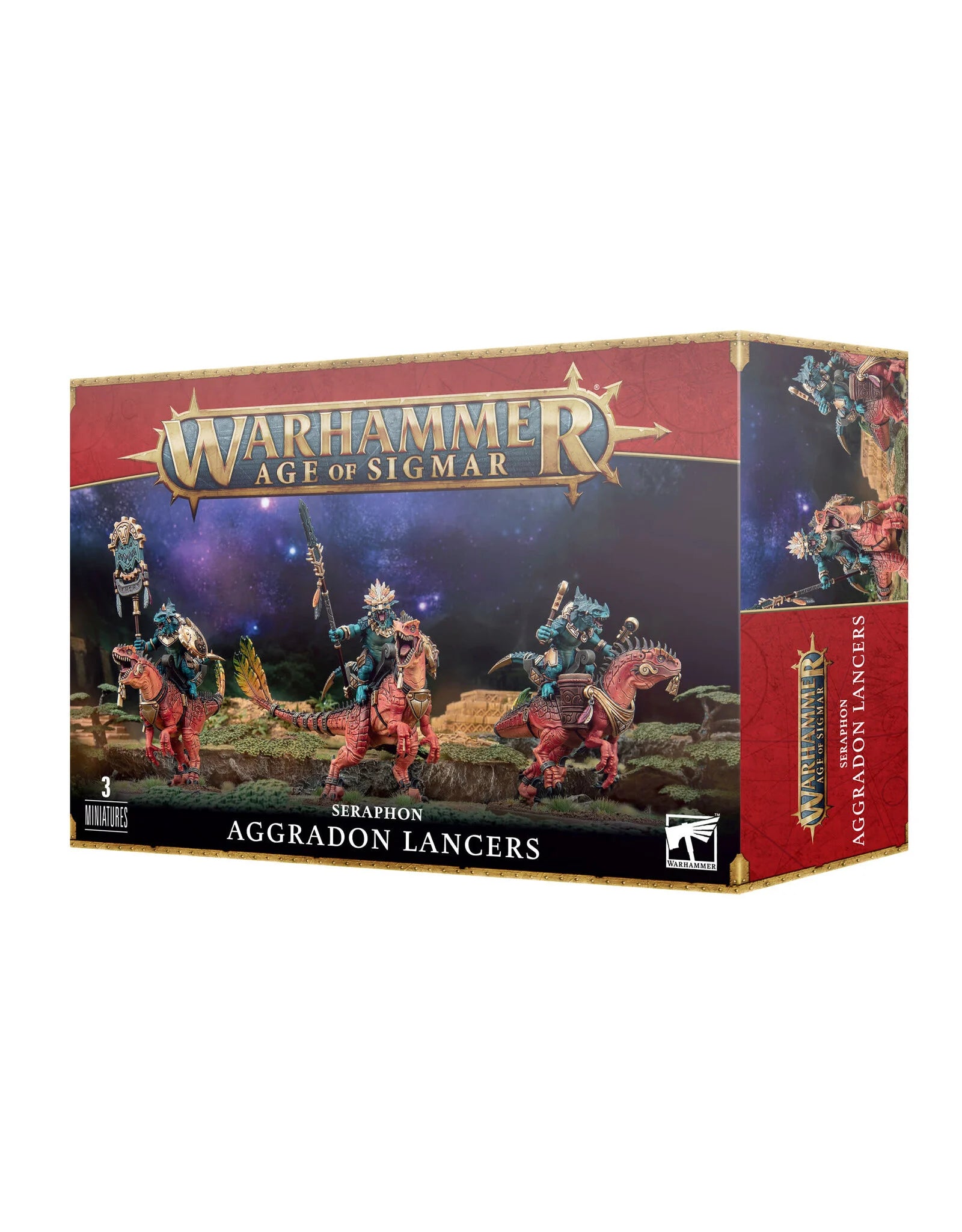 Aggradon Lancers are among the most aggressive cavalry known to the Mortal Realms, for their fearsome scaled steeds only become swifter and more ravenous as battle-frenzy overtakes their senses. A charge of Aggradon Lancers can collapse entire battlelines in a storm of predatory violence, riders and mounts alike lashing out with savage force and overwhelming ferocity.