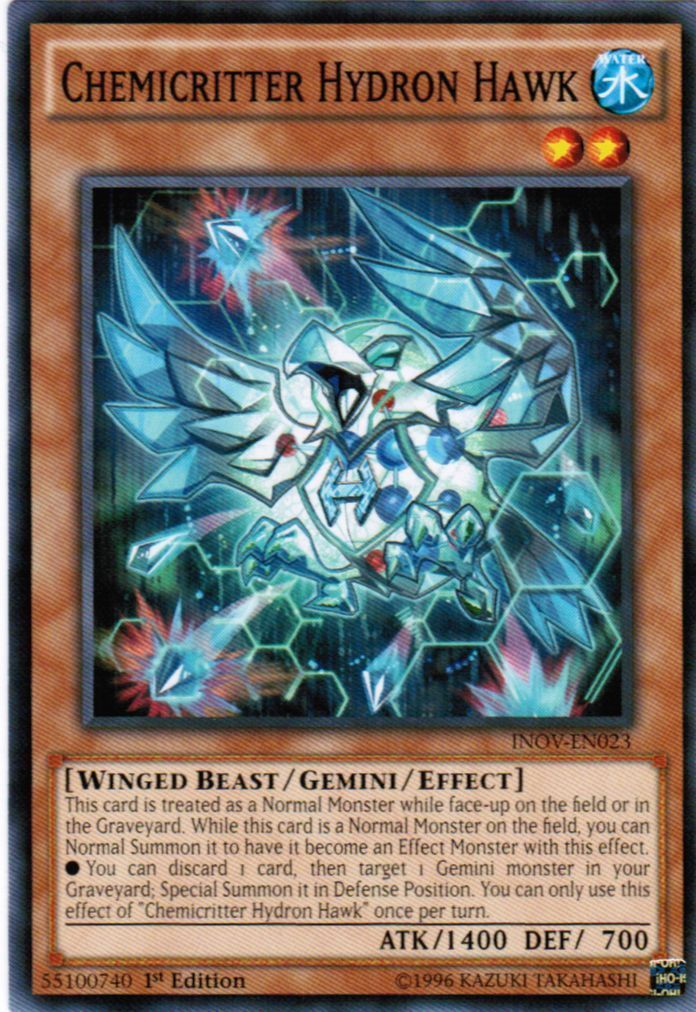 •You can discard 1 card, then target 1 Gemini monster in your Graveyard; Special Summon it in Defense Position. You can only use this effect of "Chemicritter Hydron Hawk" once per turn.