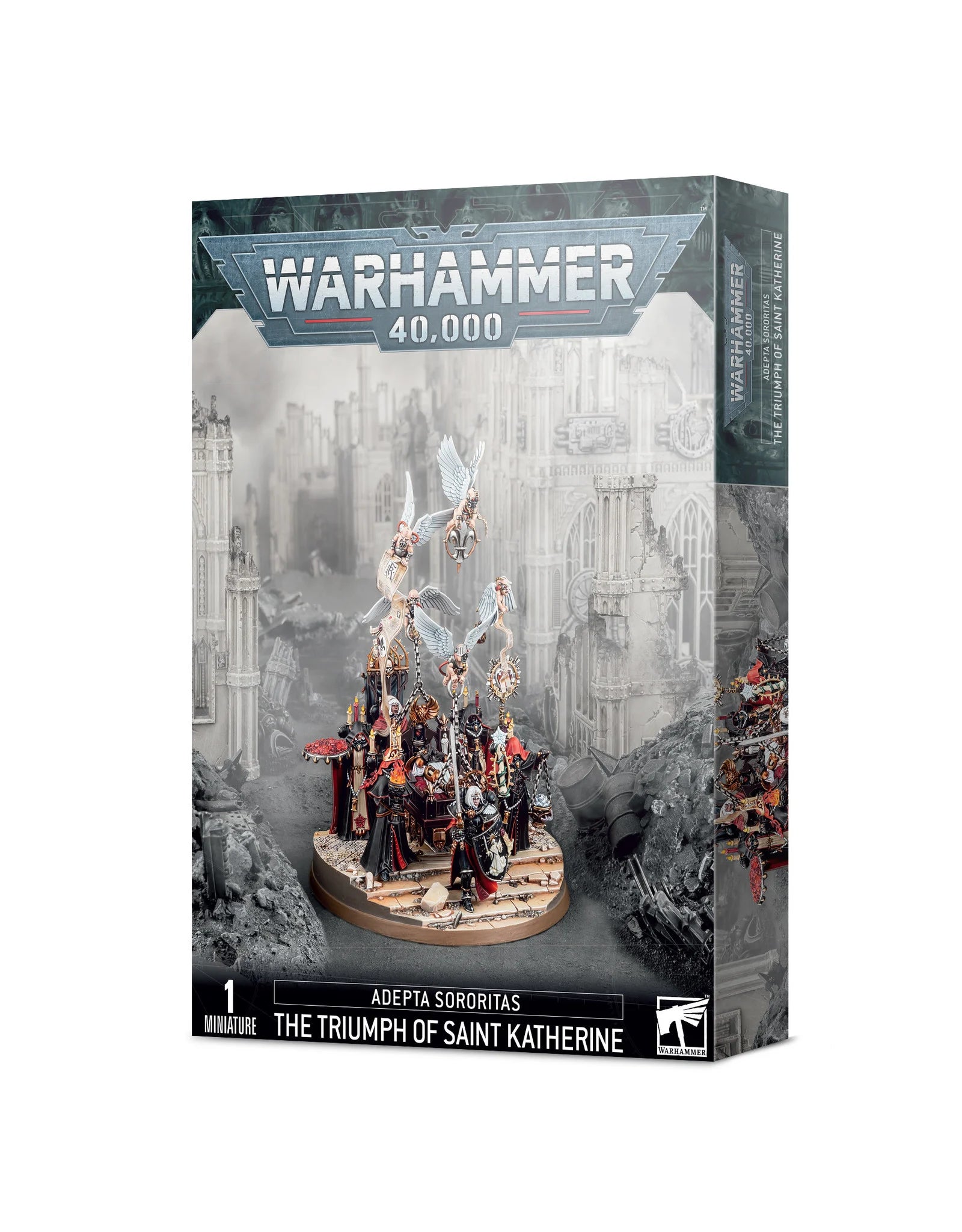 Where the Triumph of Saint Katherine marches, there shines the Emperor’s radiance. With every step, this funerary procession spreads the glory of the martyred Matriarch further across the galaxy, scattering before it the enemies of the faith and instilling in the Sisters of Battle the fiery conviction of Katherine herself. Yet it is not only the founder of the Order of Our Martyred Lady who is venerated by the Triumph, for through its presence are the spirits of all six Matriarchs carried to the front lines. Accompanying the blessed bier that bears the skeletal remains of Saint Katherine within her reliquary armour are six members of the Orders Pronatus. Each of these handpicked exemplars of the Adepta Sororitas embodies one of the canonised Matriarchs of the six original Orders:Saint Katherine, Order of Our Martyred Lady, Saint Dominica, Order of the Ebon Chalice, Saint Mina, Saint Silvana, Order of the Argent Shroud, Saint Lucia, Order of the Valorous Heart, and Saint Arabella, Order of the Sacred Rose. This box contains: