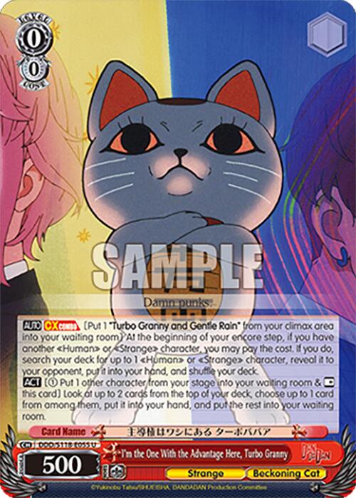 [AUTO] [CXCOMBO] [Put 1 " Turbo Granny and Gentle Rain" from your climax area into your waiting room] At the beginning of your Encore step, if you have another "Human" or "Strange" character, you may pay the cost. If you do, search your deck for up to 1 "Human" or "Strange" character, reveal it to your opponent, put it into your hand, and shuffle your deck.[ACT] [(1) Put 1 other character from your stage into your waiting room & [REST] this card] Look at up to 2 cards from the top of your deck, choose up to 1 card from among them, put it into your hand, and put the rest into your waiting room.