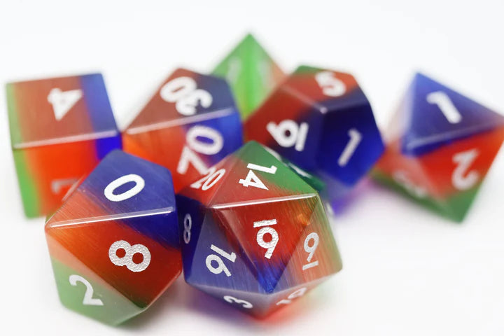 Consists of a D4, D6, D8, D10, D12, D%, D20 plus a dice case